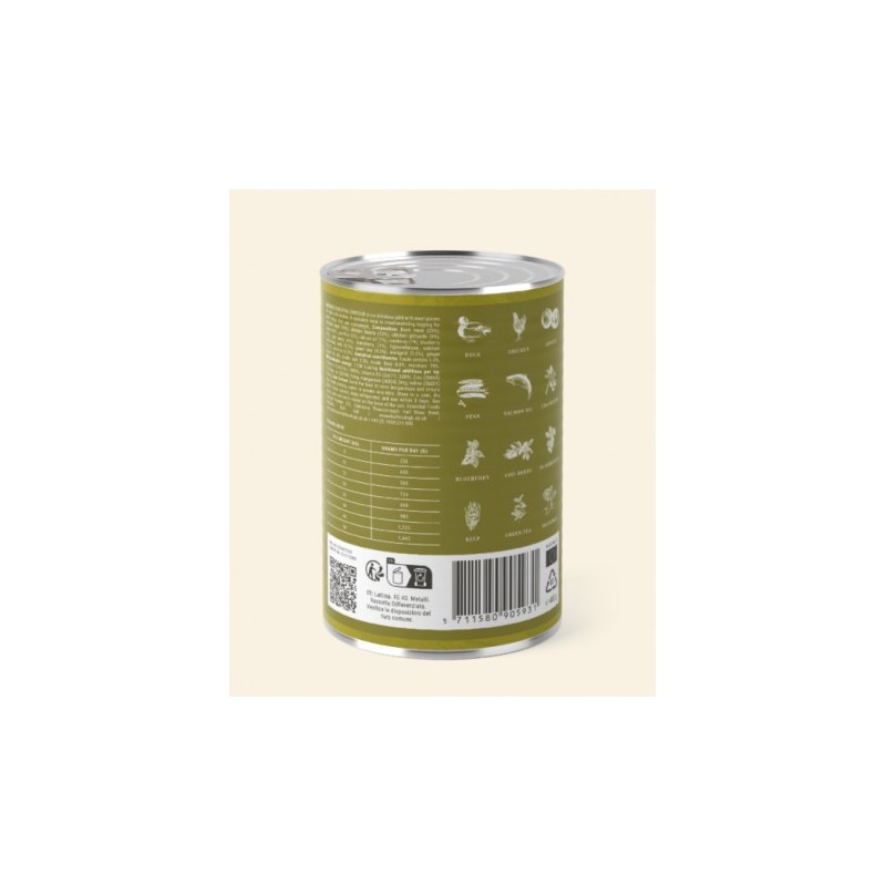 Sammensætning: Andekød (25%), kyllingekød (19%), kyllingehjerte (12%), kyllingekråse (9%), æbler (2%), ærtemel (2%), lakseolie (1%), tranebær (1%), blåbær (1%), gojibær (1%), brombær (1%), lignocellulose, calciumcarbonat, tang (0,2%), grøn te (0,2%), morgenfrue (0,2%), ingefær (0,2%), spirulina (0,2%).