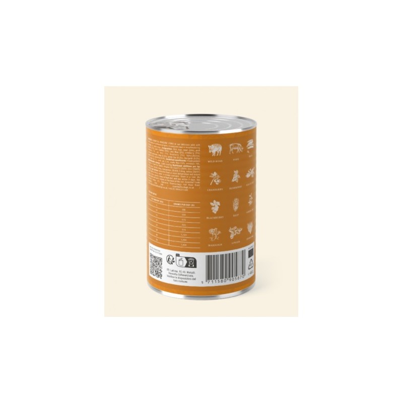 Sammensætning: Vildsvinekød (26%), grisehjerte (20%), griseluftrør (19%), ærtemel (2%), tranebær (1%), blåbær (1%), gojibær (1%), brombær (1%), lignocellulose, calciumcarbonat, tang (0,2%), grøn te (0,2%), morgenfrue (0,2%), ingefær (0,2%), spirulina (0,2%).